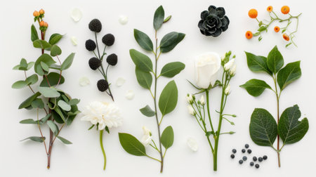A beautiful collection of fresh flowers and greenery arranged aesthetically on a white background. Perfect for floral inspiration, decoration, or craft projects.