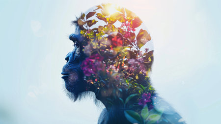 A profile shot of a Bonobo, with a soft, blurred overlay of colorful flowers. The image is taken in a natural setting, and the light from the sun shines through the flowers, creating a gentle, ethereal feel.