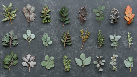 A stunning flat lay of assorted leaves and herbs on a dark slate surface, showcasing the beauty and diversity of nature, perfect for organic themes and natural decor projects.