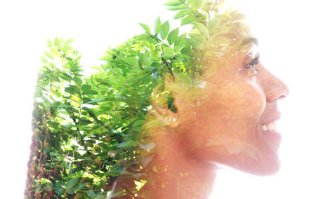 Double exposure, portrait of a young happy woman.