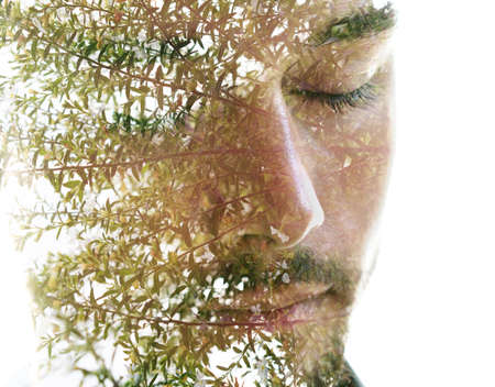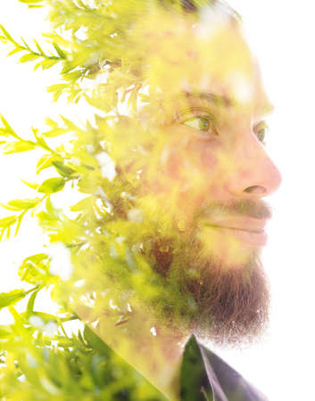 A double exposure portrait of a man combined with an image of green leaves.