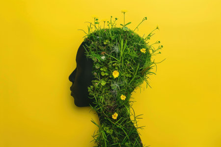 Mans head covered in grass and flowers against a vibrant yellow background, surreal concept art portrait