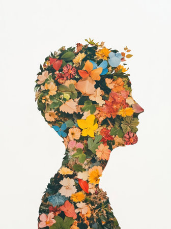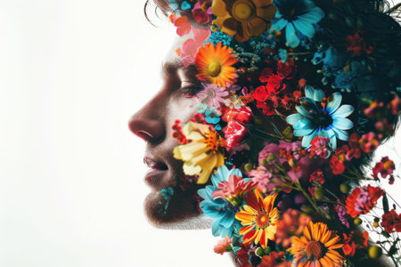 A profile of a man surrounded by colorful flowers, blending nature with human features, creating a harmonious and artistic expression