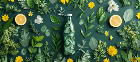 Decorative flat lay with green-toned natural elements like leaves, herbs, and fruits