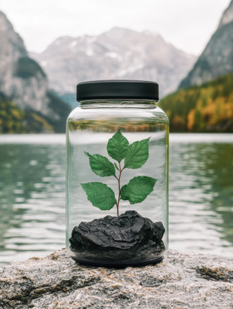 plant growing in glass jar with nature background