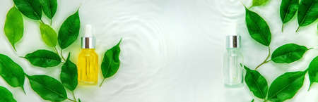 Cosmetics in a bottle in water, skin hydration concept. Selective focus. Nature.