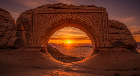 dramatic sandstone arch with glowing sunset, created with generative ai