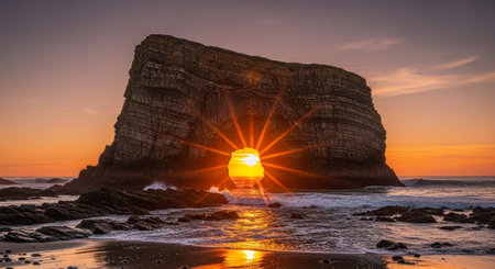 Breathtaking Sunset Over Ocean with Dramatic Rock Archway, Waves Crashing on Sandy Beach Shoreline