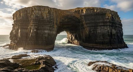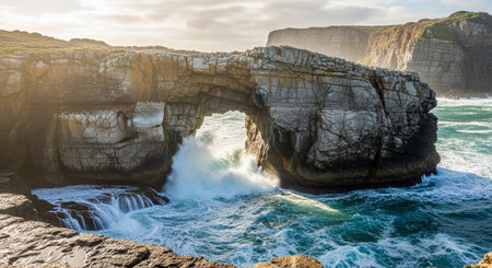Natural arch in rocky cliffs overlooking a vibrant ocean, warm sunlight hitting the rocks, scenic formation with room for layout