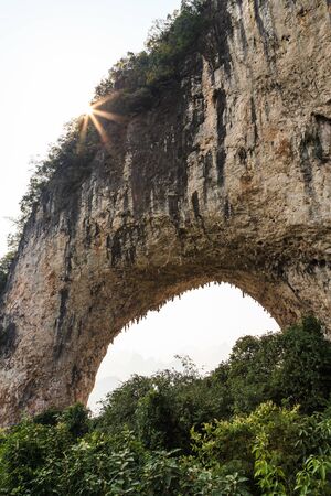 A natural stone arch spans over a tranquil turquoise ocean, as the sun rises. The image displays a scenic coastal setting with verdant vegetation and rocky shores. Ideal for various commercial uses, the composition highlights the interplay of light and shadow, and the natural textures.