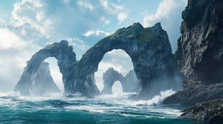 Dramatic rock formations rise from the ocean, creating natural arches and intriguing shapes. The image displays a day scene with a dynamic interplay of light and shadow, highlighting textures. This scenery could be used for various commercial projects and editorial content related to travel or nature.
