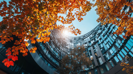 Bright sunlight filters through vibrant autumn leaves, illuminating a contemporary building with glass panels in an urban environment. The scene captures the essence of fall