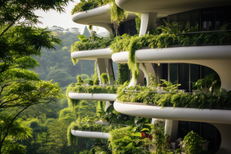 Architectural detail of an eco-friendly residential building with balconies lush with integrated greenery and sustainable design. AIG41