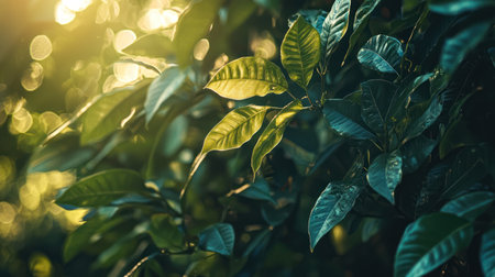 A Lush green leaves illuminated by warm sunlight, creating serene and natural atmosphere with soft bokeh in background