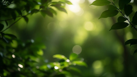 Filtering showing lush green leaves with soft bokeh and bright sunlight filtering through creating a natural serene and peaceful outdoor forest or garden atmosphere...