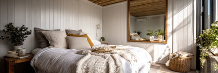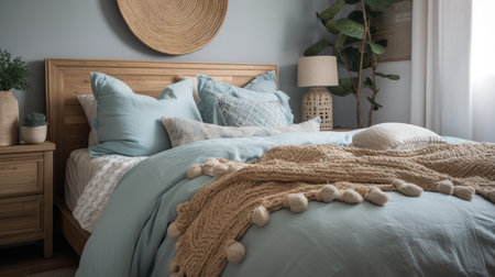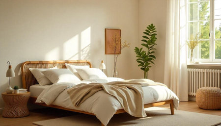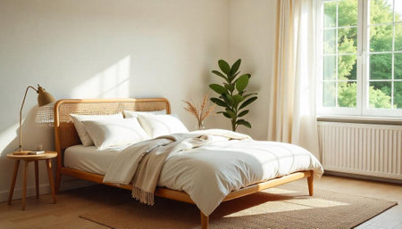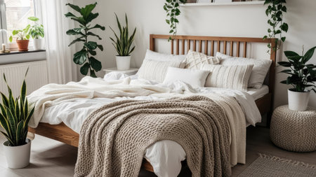 A well-lit bedroom showcases a wooden bed covered with white linens and a beige knitted blanket. Potted plants add a touch of greenery. The scene is illuminated by natural light, creating a comfortable and inviting atmosphere suitable for interior design projects and lifestyle publications.