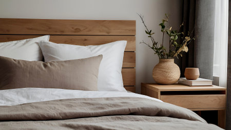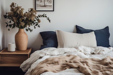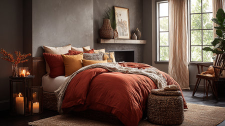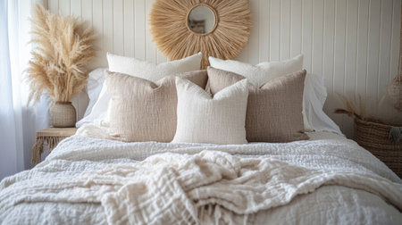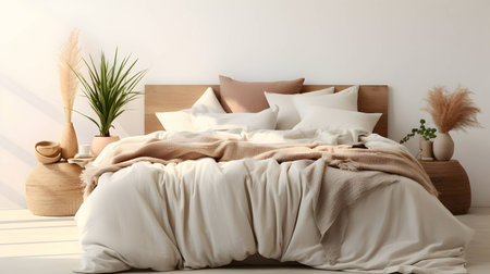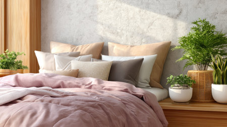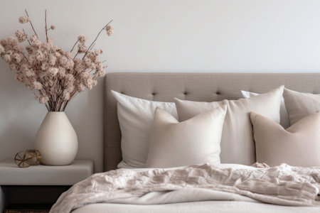 Cozy bedroom setup with pillows and an upholstered headboard. Fall minimalist simple composition. AI generated illustration