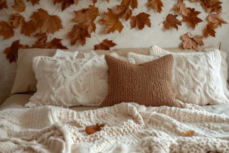 Cozy bedroom with a beige bed and pillows, autumn leaves on the wall, a close-up of a white blanket and a brown knitted pillow, home interior design in warm colors. --ar 3:2 --v 6.1 Job ID: 247934d7-dc44-49ae-a507-0d337220bc59