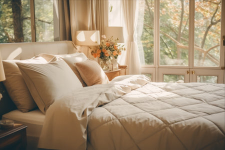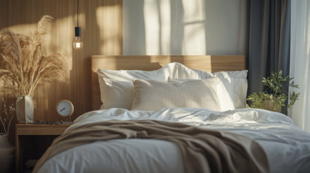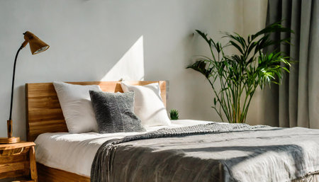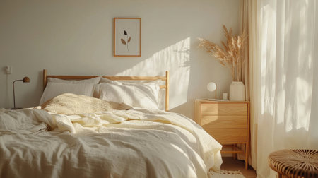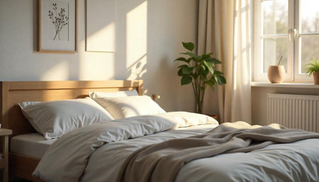 Cozy bedroom interior bathed in morning sunlight serenity scene