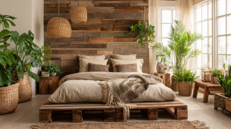 A beautifully designed bedroom features a wooden wall plush bedding and lush plants basking in sunlight.