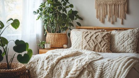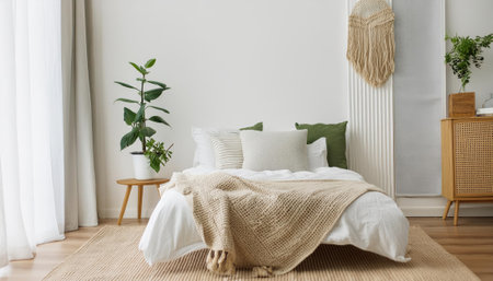 Cozy bedroom interior with cozy bed, plaids and plant in wicker basket