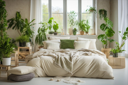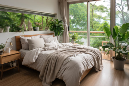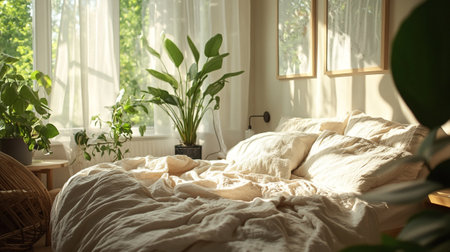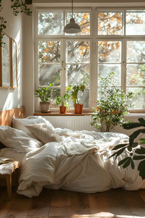 This cozy bedroom interior captures the elegance of natural light filtering through large windows, highlighting lush green plants and stylish decor.