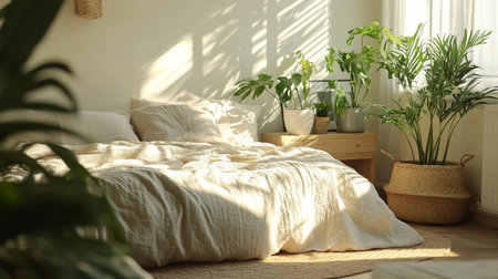 A serene bedroom featuring a cozy white bed illuminated by warm sunlight. Fresh green plants add tranquility to the inviting space, creating a calming atmosphere for relaxation.