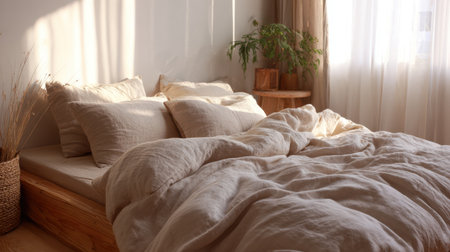 Soft beige linen bedding in a minimalist bedroom with natural wood elements and morning sunlight filtering in