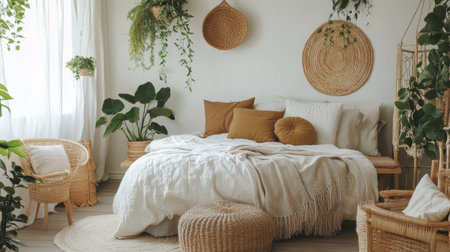 A beautifully arranged bohemian bedroom featuring cozy bedding, indoor plants, and rattan furniture. This space embodies tranquility with earthy tones and natural textures, perfect for relaxation.