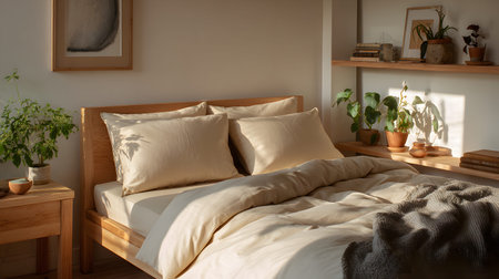 An organic cotton bedding minimalist bedroom wooden bed frame natural light indoor plants cozy serene modern neutral color morning