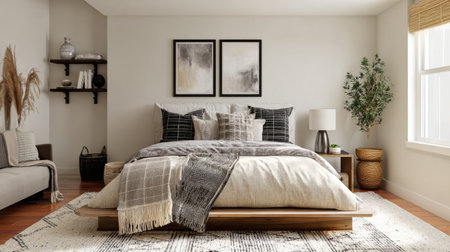 Stylish bedroom interior with natural light and cozy decor in a serene environment. Generative AI