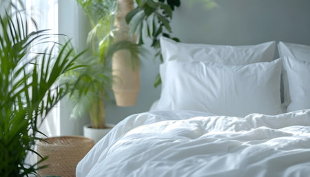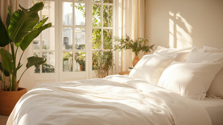 A cozy sunlit bedroom featuring soft white bedding and lush green plants. The scene radiates tranquility, perfect for relaxation and comfort in modern decor.