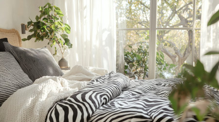 Wide shot of a bedroom featuring soft zebra print bedding with cozy decor and natural light. concept of interior design, bedroom comfort, serene living space..
