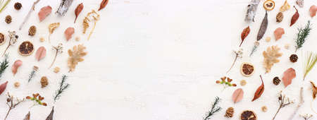 Top view image of autumn forest natural composition over wooden white background .Flat lay. Banner