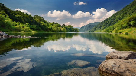 Landscape of beautiful mountain lake with blue sky and clouds reflected in water