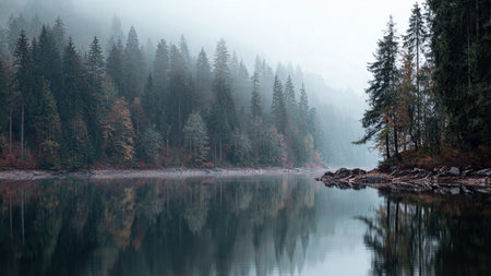 Misty morning lake with serene reflection, calm and peaceful atmosphere