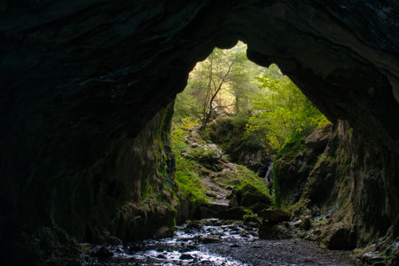 Cave entrance to lush green forest - A mysterious cave opening leading to a vibrant, sunlit forest with a stream and moss-covered rocks.