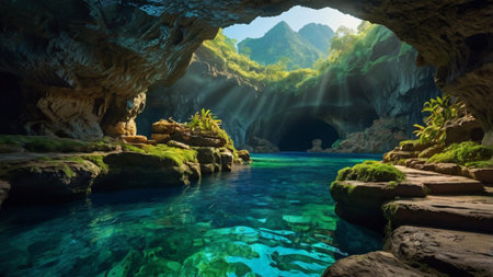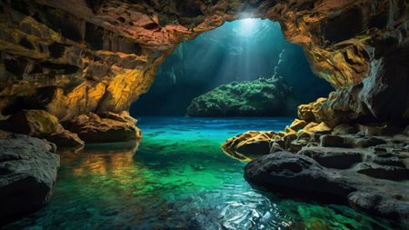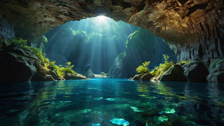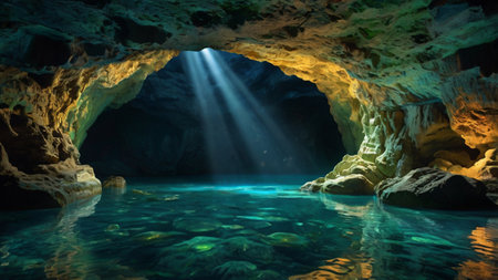 Beautiful view of the underwater cave with sunlight shining through the hole