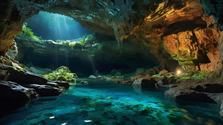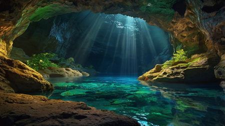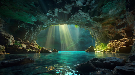 Beautiful underwater cave with light rays coming through the hole in the rock