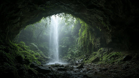 Beautiful view of the waterfall in the cave. Shot in Malaysia.