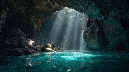 Sunlight filters through cracks in a rocky cave, illuminating ancient stones and showcasing unique textures. The interplay of light and shadow creates a mystical atmosphere deep within the earth.