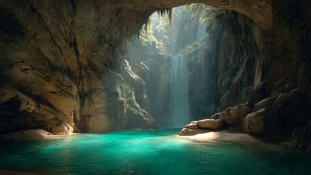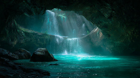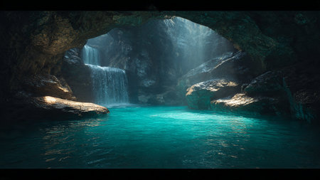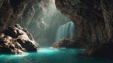Beautiful waterfall in a cave with crystal clear water. 3d rendering