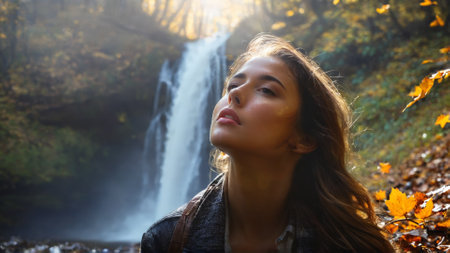 Enchanted woman discovering a hidden autumn waterfall leaves floating misty spray magical forest ambiance