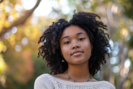 A young woman standing confidently in front of a tall tree, showing a connection with nature.
