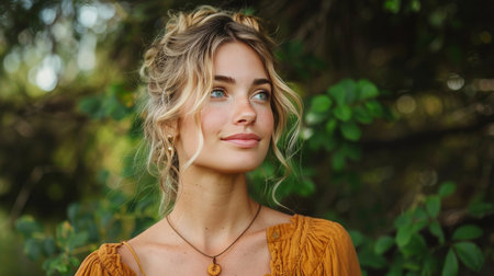 Dreamy woman in sunlight with natural beauty and peaceful expression, enjoying the serene atmosphere of nature, serenity concept