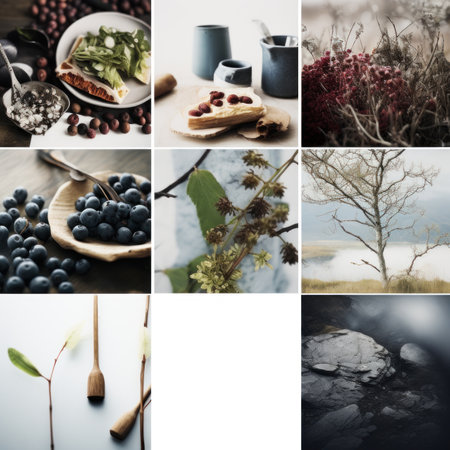 Nature collage showcasing colorful flowers, leaves, and berries in a vibrant arrangement