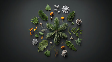 Christmas composition. Spruce branches, cones, berries on black background. Flat lay, top view, copy space