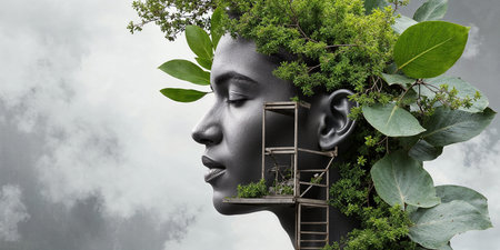 A striking double exposure image featuring the silhouette of a woman's head in profile, overlaid with vibrant foliage, symbolizing nature and human connection.