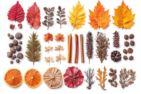A vibrant display features various autumn leaves, dried orange slices, and a selection of herbs and spices, capturing the essence of fall in an organized layout against a white surface.
