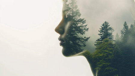 Nature merges with a womans portrait in a double exposure, where forest trees transform into her face